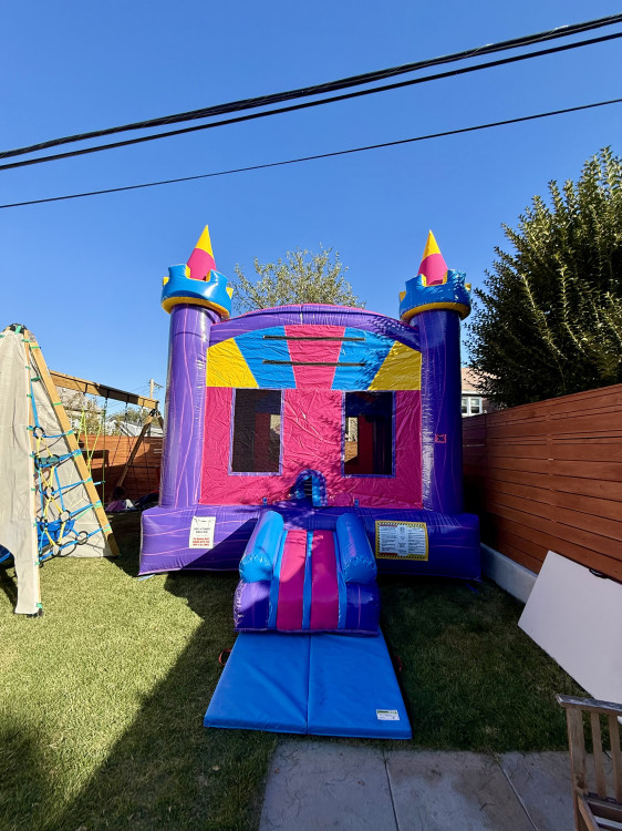 Our beautiful Pink Castle bouncer, great for birthday parties, and any event. Inside has two poles for kids to play and a basketball ring.  Setup area: 18' L x 17' W x 16' H